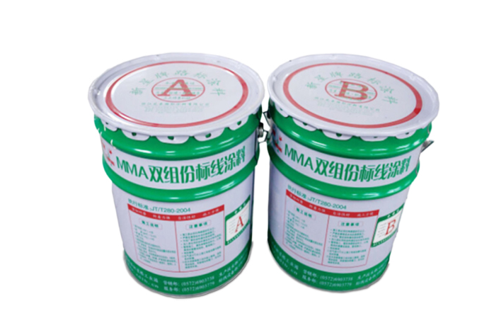 双组份标线涂料是由两组不同的低粘度丙烯酸单体树脂制成的(A、B两组)不同组份的路标涂料。施工前将催化剂加入B组份并搅拌均匀,施划时A、B组份充分混合在催化剂的作用下,迅速发生交联反应,形成坚固的涂膜(标线)。