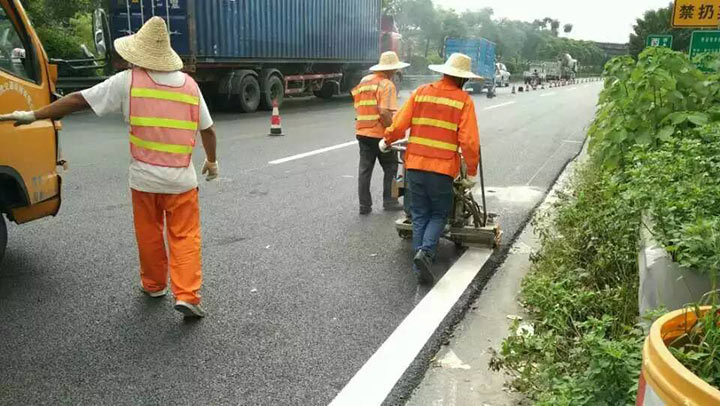 4、冬季施工,涂层遇冷收缩,产生内应力,这种应力集中一处时,极易产生裂纹。因寒冷而出现的裂纹与施工季节和热熔标线涂料性能有关,也与路面状况有关。尤其是新铺设的水泥路面有脆弱的灰浆层,或养护薄膜,容易产生裂纹。